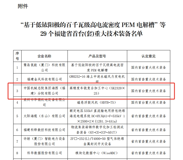 近日,福建省工信廳發(fā)布了《關(guān)于公布“基于低銥陽極的百千瓦級高電流密度PEM電解槽”等29個福建省首臺(套)重大技術(shù)裝備的通知》,海西分院開發(fā)的“高精度車銑復(fù)合加工中心(XK2320×25)”榮獲國內(nèi)首臺重大技術(shù)裝備認定。